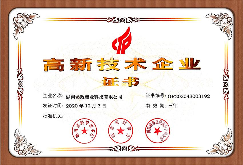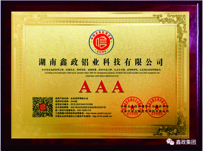 瀏覽次數(shù):1148近日,鑫政集團(tuán)子公司鑫政鋁業(yè)喜報(bào)頻傳,再獲殊榮。根據(jù)湖南省2020年高新技術(shù)企業(yè)認(rèn)定規(guī)定,經(jīng)專家評(píng)審、權(quán)威公示等程序,鑫政鋁業(yè)憑借產(chǎn)品研發(fā)、科研人才培養(yǎng)、質(zhì)量把控等方面的出色表現(xiàn),榮獲“高新技術(shù)企業(yè)”榮譽(yù)稱號(hào)。同時(shí),經(jīng)過中國企業(yè)信用誠信公示服務(wù)平臺(tái)的嚴(yán)格審核,該公司榮獲“AAA級(jí)企業(yè)信用等級(jí)”證書。