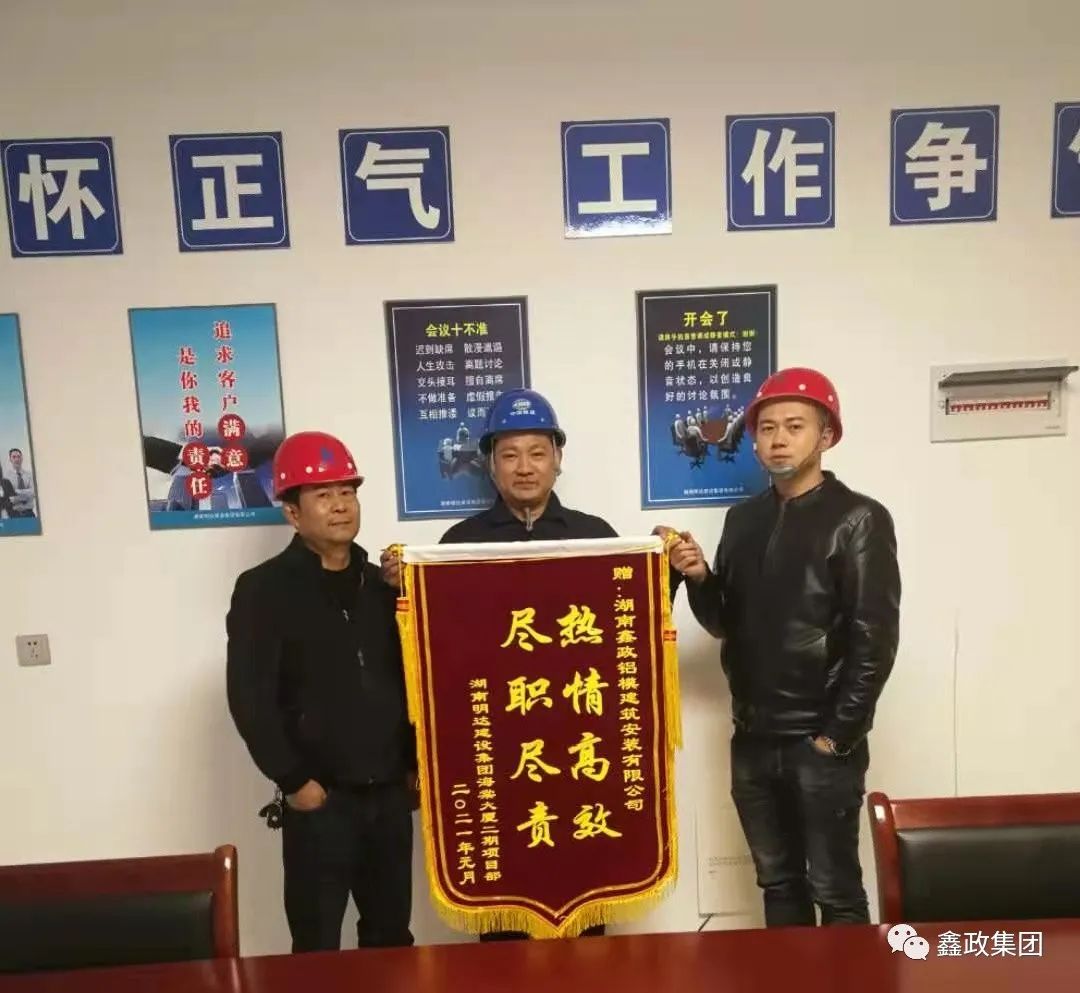 瀏覽次數:1177新年新氣象,鑫政開門紅。近日,湖南明達建設集團有限公司益陽海棠大廈項目部送來錦旗和感謝信,對鑫政安裝工程服務部申立軍同志在項目上熱情高效的工作表現,給予了充分肯定和高度評價。