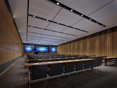 1、吸音吊頂:多功能廳頂部的施工處理主要是隔音和聲學(xué)效果處理。頂棚的吸聲面積,對整個室內(nèi)的吸聲起著關(guān)鍵作用。因此處理好頂棚吸聲對整體的聲學(xué)設(shè)計至關(guān)重要。經(jīng)計算分析,頂棚使用隔聲吸聲符合吊頂?shù)穆晫W(xué)處理方式。燈光處采用鋁格柵吊頂,面光燈嵌入吊頂里,頂部四周采用聚酯纖維吸音板,形成美觀造型的吊頂。